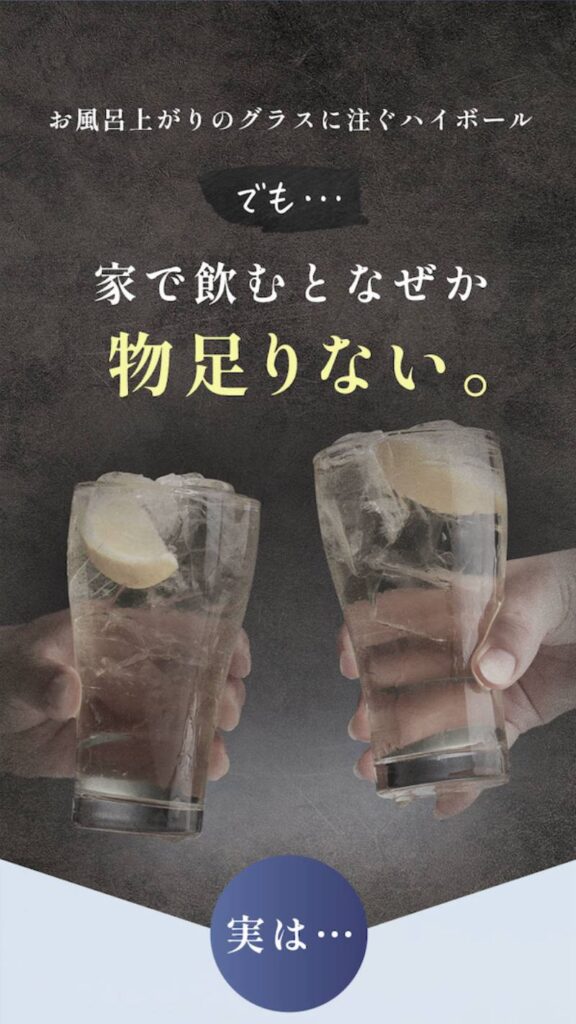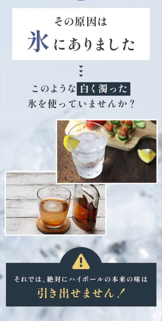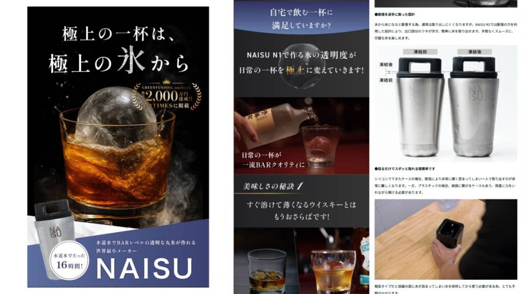 | Comment | NAISU N1の価値を正しく伝えるため、高級氷市場の動向からユーザー心理、利用シーンまで丁寧にリサーチしました。競合の丸氷メーカーや一般的な製氷器を横断的に比較する中で、「大きな氷を作れるだけでは、本当に求められている価値は届かない」という課題を発見。ユーザーが重視しているのは、“溶けにくさ”“透明感のある見た目”“飲み物との相性による体験価値”であることが明確になりました。 そこで、一般的な製氷器との違いが直感的に理解できる比較構成を設計。NAISU N1の強みが視覚的にも伝わるLP構成とすることで、「なぜ一般的な丸氷ではなく NAISU N1 なのか」を迷わず理解できる導線づくりにこだわりました。 |