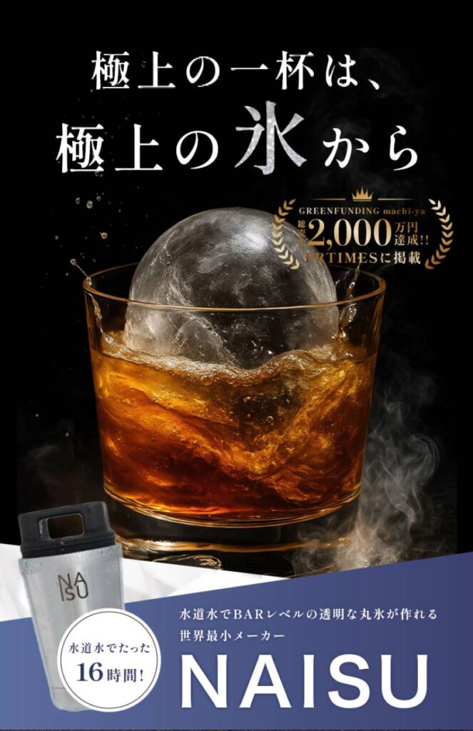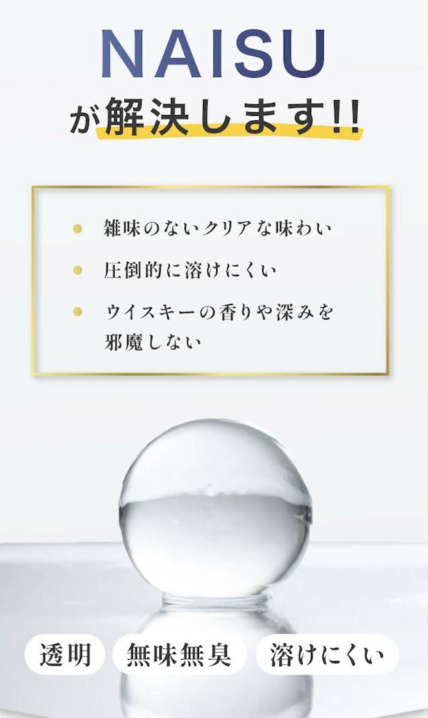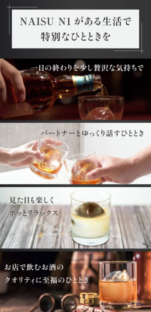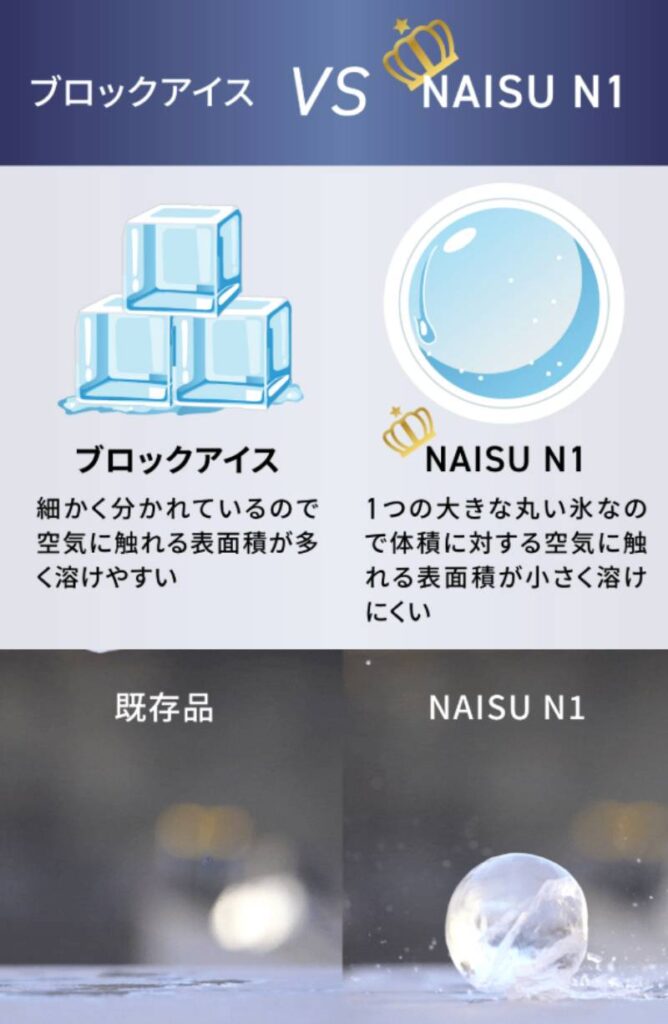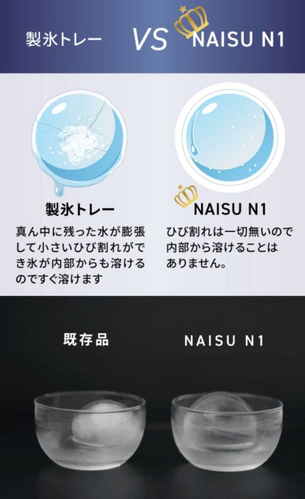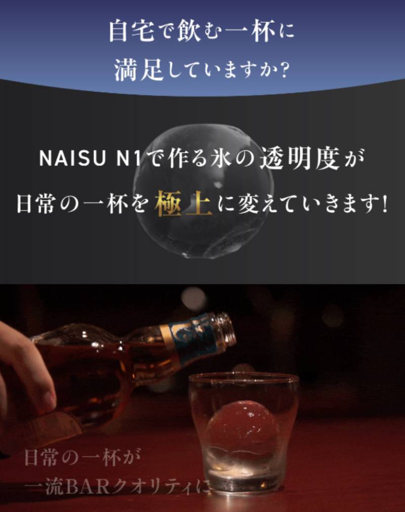 | Outline | NAISU N1は、自宅でもバーのような大きくて透き通った丸い氷をつくれる製氷機です。一般的な製氷器では白く濁ったり、すぐ溶けて飲み物が薄くなってしまいがちですが、NAISU N1 は独自のつくり方で、中心までしっかり透明な“クリアアイス”を作ることができます。65mmの大きな丸氷は見た目も美しく、ウイスキーやカクテルはもちろん、アイスコーヒーなどにもぴったりです。溶けにくいため飲み物の味を長時間楽しめます。使い方も簡単で、冷凍庫に入れるだけ! 自宅の時間を少し贅沢にしたい人や、ギフトとしても選ばれているアイテムです。 |
